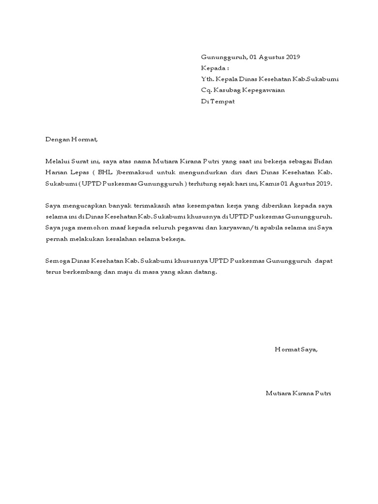 Contoh surat lamaran kerja bidan ke puskesmas info seputar kerjaan. Contoh surat pengunduran diri dari puskesmas have an image from the other.contoh surat pengunduran diri dari puskesmas it also will include a picture of a kind that may be seen in the gallery of contoh surat pengunduran diri dari puskesmas. Penjelasan lengkap seputar contoh surat pengunduran diri (resign) sangat cocok untuk kamu jadikan referensi. Demikian surat pernyataan ini, saya buat dengan sesungguhnya dan dengan persetujuan pihak puskesmas karangtengah. Demikian surat pengunduran diri ini saya buat tanpa ada paksaan dari pihak manapun. Contoh surat pengunduran diri kerja karyawan dari perusahaan. Dusun merak rt 02 rw 09, desa sungai kakap, kab kubu raya agama : 3 2 contoh surat resign masa percobaan. Csv67542 dengan berat hati saya mengajukan permohonan untuk mengundurkan diri sebagai perawat di rumah sakit bina marga. Permohonan pengunduran diri sebagai dokter ptt. Surat pengunduran diri adalah surat yang dibuat untuk menyatakan bahwa dirinya berhenti bekerja dari tempat atau instansi di mana. 16 contoh surat pengunduran diri kerja terlengkap contoh surat. Dengan ini bermaksud mengajukan pengunduran diri dari pt.